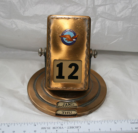 Below is a brass "perpetual" calendar of the type that changes day and date by simply rotating the rectangular part to change the date, and turning the thumb wheels on the base to change the day and month. It has the logo of the Pratt & Whitney engine company on it, probably a souvenir given to Chourré during a plant visit.