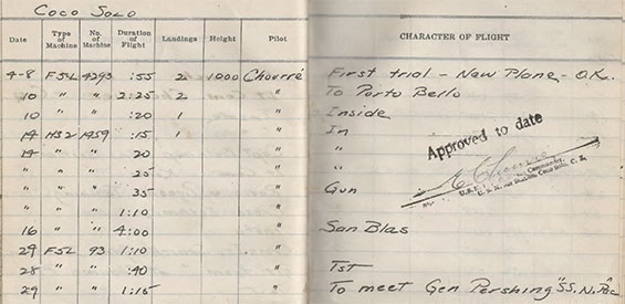 Choureé flew the airplane pictured, on the date cited, as evidenced in his pilot log book number one, PDF page 34, below. He judged the airplane "OK," and flew it on a short cross-country mission to Porto Bello, followed by a brief "inside" flight on the 10th. "Inside" probably meant over Manzanillo Bay and not out over the Atlantic Ocean. He flew it a few times later in April, one flight cited as meeting General Pershing. Does anyone KNOW what "SS. N. Pac" means?