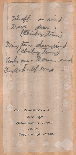 A stunning artifact found on PDF page 18 of this scrapbook is a penciled note in Charles Lindbergh's own handwriting that lists the maneuvers he performed as he flew with a Navy section of three planes. This artifact is shown at left as annotated by Choureé.