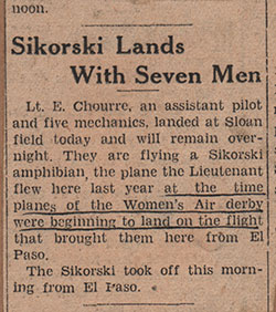Likewise, at right, is an article clipped from the Midland, TX newspaper on August 19, 1930. It reports Choureé's landing in his Sikorski (sic).