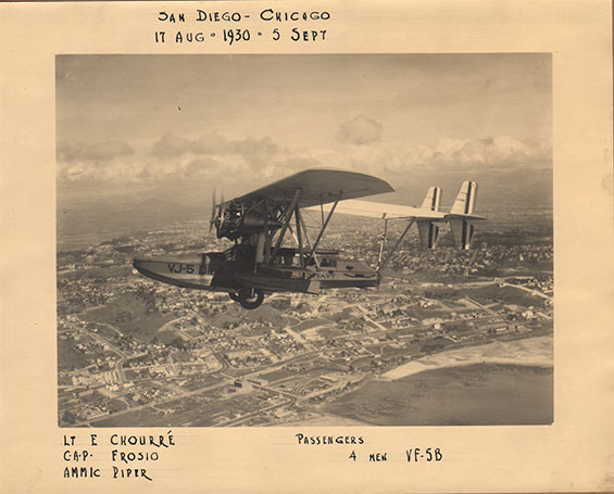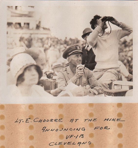 BACKGROUND Emile Choureé was a U.S. Navy pilot born in 1894. He was designated Naval Aviator #1591 in 1918 and married Catherine Davis in 1920. He was a career Navy officer, achieving the rank of Lieutenant Commander. He participated with Navy teams at the National Air Races where he served as the announcer at Naval aerobatic performances. He also flew support aircraft for the team, carrying mechanics and other support personnel, as well as tools and spares. He died in an air crash at Scott Field, East St. Louis, IL in January, 1938. He had two children. They and his wife survived him. A ship, the U.S.S. Choureé (ARV-1), posthumously was named after him. It was launched about a year before the end of WWII, on May 22, 1944, about six years after his passing. He collected and left behind a significant number of photographs, documents and memorabilia related to his naval career and personal life. These items are exhibited in the DOCUMENTS, OBJECTS, PHOTOGRAPHS, PILOT LOG BOOKS and SCRAPBOOKS sections of his Collection.