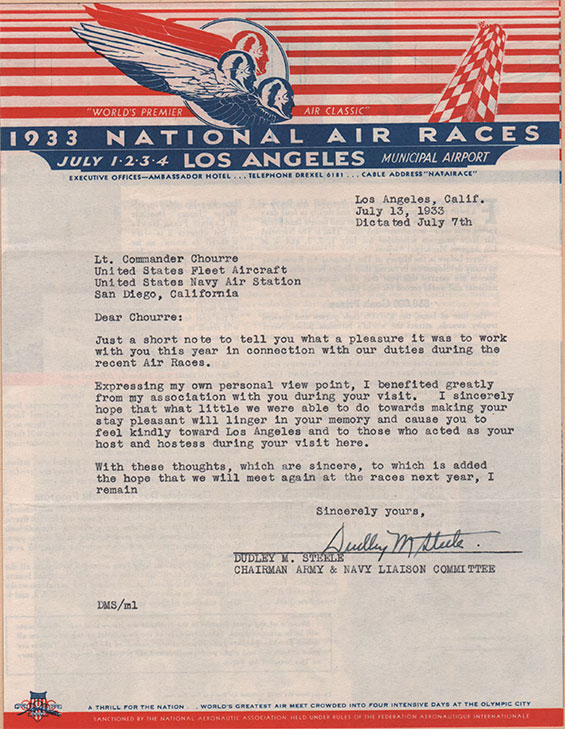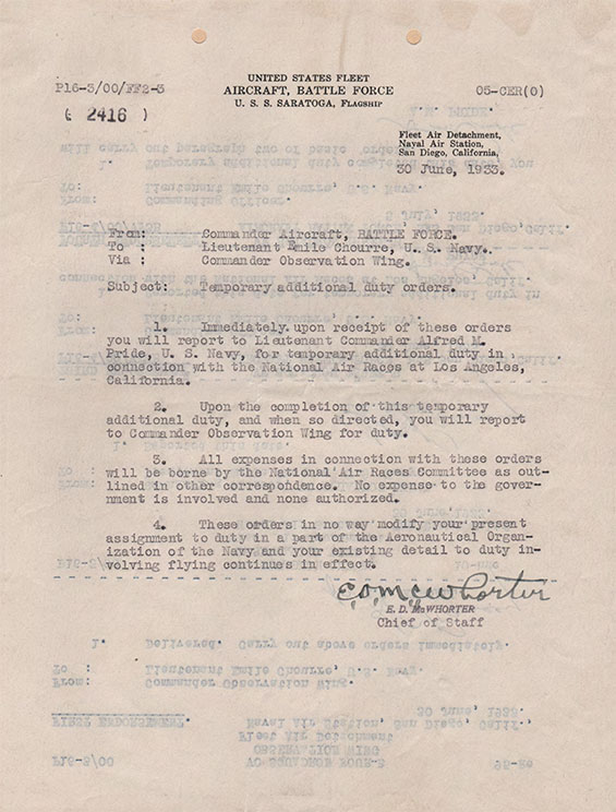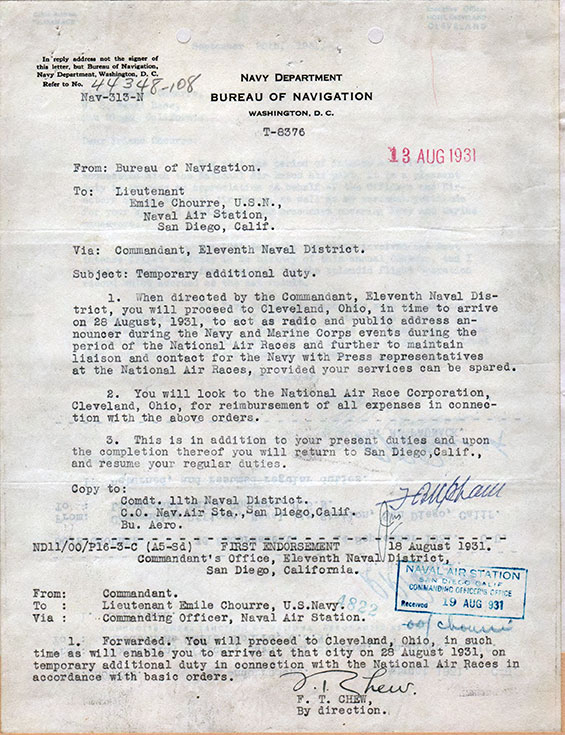 As with the 1931 NAR, above, Choureé was given orders on very short notice to attend and work at the 1933 NAR. His orders appear below, dated June 30th, only one day before the races began (PDF page 31). His commute was short, however, being only from San Diego to Los Angeles that year.