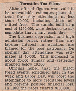 It is worth it to download and examine this pamphlet. It is a time capsule illustrating the excitment of the National Air Races. Coincidentally, the final day of the 1934 events entertained 60,000 paying customers. This was the highest attendance since 1929. News photographs in articles on PDF pages 24, 26, 34 & 38 illustrate the magnitude of the crowds.