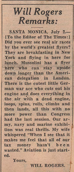 Nevertheless, according to news clippings in the scrapbook, Army and Marine Corps flyers enhanced the proceedings, performing every day (PDF pages 4-6). And times weren't so hard that Will Rogers didn't have something amusing to say to The New York TImes (ca. Monday, July 3rd), right (PDF page 6). According to one article, attendance reached 50,000 on Monday.