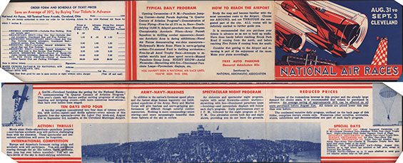 Elsewhere, the pamphlet highlighted the concentration of ten days into four. It described the typical daily program, "Action! Thrills" aerobatic activities and the special military performances. It gave directions on how to get to the airport, and a summary of special days, for example "Marine Day," "All Ohio Day," "Labor Day."