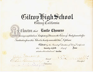 DOCUMENTS There are hundreds of documents in Choureé's Collection. Not all were digitized during my visit to the northwest. For example, one grouping, his Navy personnel jacket, spans April 23, 1927 through May 16, 1935. It comprises over a hundred fragile pages, which record his orders, assignments and promotions during that period. A second jacket contains notes and solutions to celestial navigation problems while he was at-sea on various cruises. A third folder contains correspondence and other documents related to his activities while an employee of Consolidated Aircraft. Only some of these documents were scanned. Rather, this section highlights 30 documents which are relevant to his early life, Navy training, promotions, homelife and work. An example, right, is his high school graduation certificate.