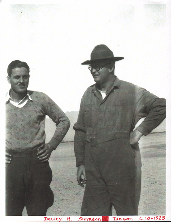 The image, below, of Dewey Simpson, right, was dated October, 1928, about a year after he brought the Register to the Airfield. The person on the left is unidentified, but his belt buckle, worn to the left side of his pants, suggests he was either a pilot or a mechanic. Both wore their buckles off center so as not to scratch the paint on the aircraft they leaned on.
