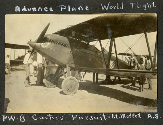 Advance aircraft, a Curtiss PW-8, for the World Flight. Note the bare-footed boy at right.