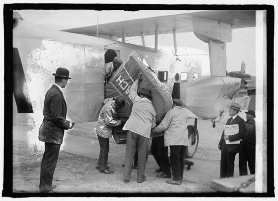The first two photos show the airplane off-loading PIANOS(!) at Bolling Field, Washington, DC. Below, one of the pianos is being lowered carefully from the narrow door of the airplane. With the packing and cushioning around it, the instrument was undoubtedly a tight fit through the door. These are glass plate negatives and I have left the borders around them for your enjoyment. The reason the pianos were delivered as freight is stated in the unsourced news article at right. One of the pianos was for Mrs. Coolidge, and will go to a community center in which Mrs. Coolidge was interested.