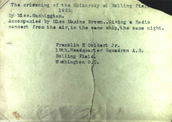 Below, the caption on the back of the photograph. We learn Ms. Owens was Miss Washington at the time. The formal typewritten label suggests this was an official military photograph, taken by F.E. Colbert, acquired by Mr. Hubbard's grandfather.