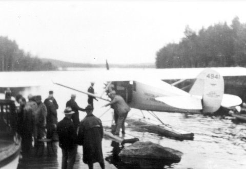 Below, courtesy of site visitor G. Clifford, are three views of NC4941 on floats at Crane Lake, MN. Note the Kingston and Rhodes Airways, Inc. livery on the fuselage. The airplane was named "Spirit of St. Louis County." The engine is wrapped in canvas. Other than the young person at lower left looking in the direction of the camera, there are no remarkable details in this scene. A man walks toward the airplane with a valise or suitcase. The crowd wears warm clothing and the sky is grey suggesting a spring or fall timing.