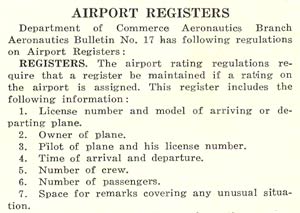 The reason these hand-written Registers are with us today is that a guideline published in the mid-1920s by the Civil Aeronautics Administration suggested that a Register be kept at each airfield (a copy of the guideline is at right). At the end of the Registers’ lives, some history-minded people, or maybe hoarders, long-forgotten, saw fit to preserve these documents for the enjoyment of their posterity.