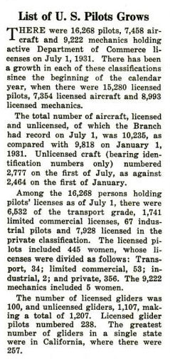 POPULAR AVIATION magazine, October, 1931. Summarized the numbers of pilots certificated in the United States, left. The link takes you to a mass of Popular Aviation magazines scanned and placed online by Google Books. If you click page 31 of the series, that will get you to the years 1929-32.