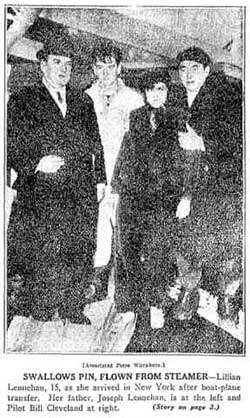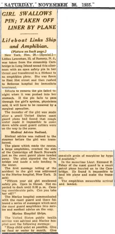 Briefly, a tteenage girl swallowed an open safety pin while on a steamship on Long Island Sound. Although he is not mentioned in the article by name, Cleveland is identified, far right, as the pilot in the photograph that accompanied the article. That photograph is below, right. The boom and wing strut of a Sikorsky amphibian can be seen behind them.There was no information in the article regarding how or why an open safety pin made it into her mouth.