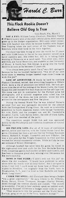 In 1952 he became the pilot for Walter F. O'Malley, who was president of the Brooklyn Dodgers baseball organization. The article at left describes his work, and makes clear that he was not a baseball fan. The article also provides background on his aviation and personal lives.