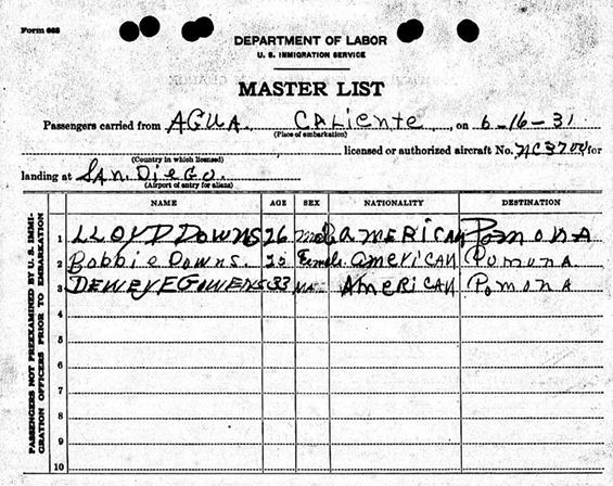 As with many Los Angeles-area commercial pilots, Downs was documented on U.S. Immigration forms upon return from Mexico. Below, an example of one such document dated June 16, 1931, which recorded Downs' return from Agua Caliente, Mexico via San Diego. He carried Bobbie, his wife, and one passenger named Dewey E. Gowens. At some point, probably early in 1930-31, Downs married Bobbie. She appeared with him as passenger on a couple of these Immigration forms. All were from Pomona, CA. June 16th was a Tuesday that year, and this flight might have been the end of a long weekend spent in Mexico.