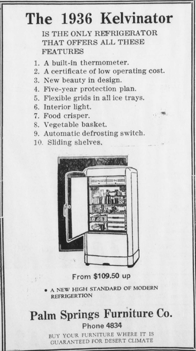The New Kelvinator Refrigerator, Palm Springs (CA) Desert Sun, April 24, 1936 (Source: Web)