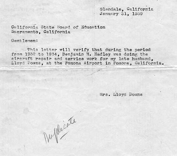 In what must have been a difficult task for her, Bobbie Downs drafted the letter below less than a year after her husbands death. The letter is self-explanatory, providing the briefest of testimony on behalf of the letter's subject, Behjamin H. Hadley. Thanks to the son of the letter's subject for sharing this letter with us.