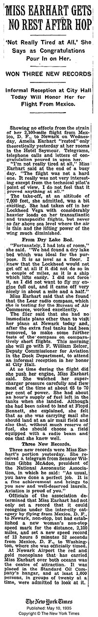 Lear had developed a radio compass for small aircraft, which Earhart was recruited to use in her Los Angeles to Mexico City record flight on April 19th. She completed that flight in her Lockheed Vega in 13 hours, 23 minutes. She then flew on May 8, 1935, from Mexico City to Newark, NJ, in 14 hours, 19 minutes.