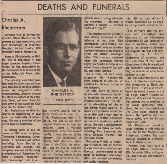A spectacular aircraft collision in 1942 placed Rheinstrom in the news. Rheinstrom is quoted from the Hammond (LA) Times of October 25, 1942, "The Air Lines, on the authority of CHARLES A. RHEINSTROM, issued this statement: "American Air Lines flight 28 eastbound, from Los Angeles to New York, was in collision with an army bomber and crashed one-half mile west of Palm Springs at 5:15 p. m. (8:15 p.m. EWT) Friday, Oct. 23. All nine passengers and crew of three were killed. The trip left at 4:30 p.m. and was at normal cruising altitude on course; clear weather and daylight when accident occurred." Later it was determined that the bomber pilot and the AA pilot had planned ahead of time to fly in formation for a short distance after the liner departed Los Angeles. The bomber pilot took off purposely to rendezvous with the liner. The collision occurred as they tried to get aligned.