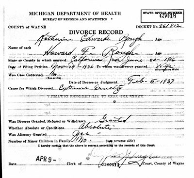 Early 1937 was a turbulent and stressful time for Rough, now in his 47th year and probably suffering a mid-life crisis. On February 5, 1937 Katherine Rough divorced Howard for the cause of "Extreme Cruelty." She was granted alimony of an unspecified amount.
