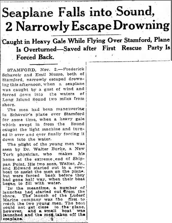 I found one reference that suggested he was an aviator (a clarification of his pilot status was made in the article announcing his wedding in 1935, below). An article in the Bridgeport Telegram, November 3, 1924, below, described a seaplane crash that put him and a passenger in the water in Long Island Sound off Stamford. The article states that the small airplane belonged to Schavoir, but the identity of the pilot in command was not clear.
