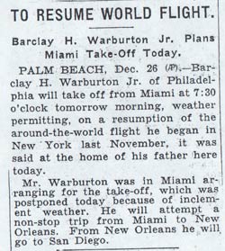 Below, from the December 27, 1930 Times, we learn that he made it to Miami, FL. His departure was delayed by weather.