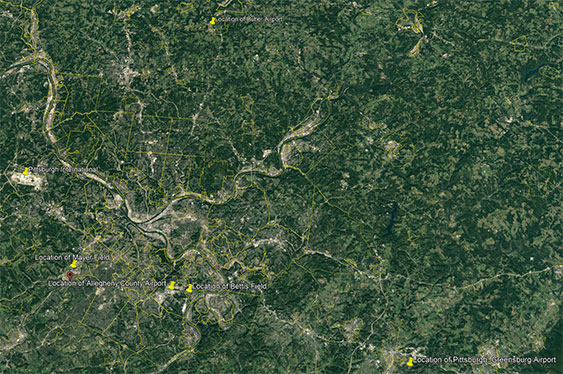 Below is a Google Earth map with yellow pins inserted at the locations of the five airfields specified by latitude/longitude values in the listing above. You might need to zoom your page to read the pins. I also identified the Greater Pittsburgh International Airport (PIT, far left), which opened in 1952. All the Golden Age fields are no more, except for Butler and Allegheny County, which still operate.